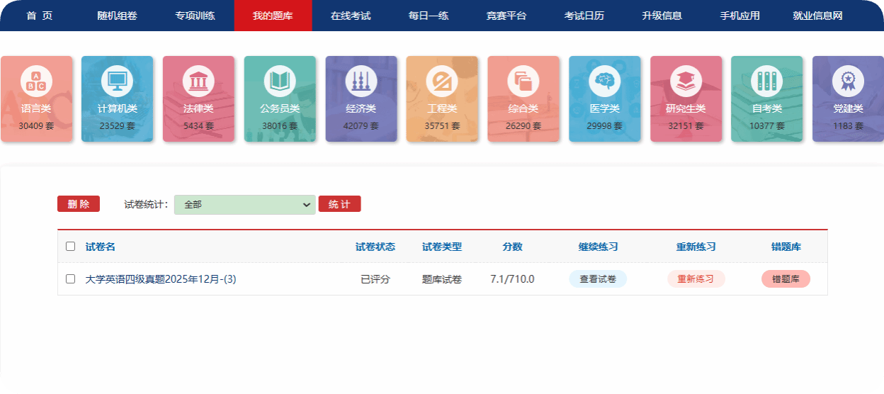 “银符考试题库”资源丰富、体系完备,涵盖语言类、计算机类、法律类、公务员类、经济类、工程类、综合类、医学类、研究生类、自考类、党建类十一大专辑,300大类考试科目、900余种资源、28万余套试卷、1000余万道试题。题库覆盖公共英语、会计、建造师、法考、考研、公考、医护等数百种考试科目,包含大量历年真题与模拟试题,紧扣国家考试大纲,全面满足学历提升、职业资格、专业技能等各类备考需求。其中经济类、公务员类、工程类、医学类、研究生类资源尤为突出,试卷量均超三万套,各专辑科目分类精细、内容权威,适用于院校教学、考前冲刺、自主练习等多种场景,为广大考生提供一站式、高质量的备考资源保障。
