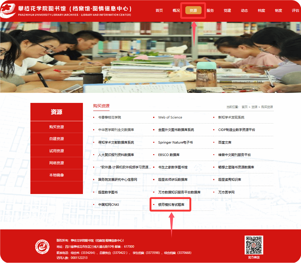 1.登录“攀枝花学院图书馆官网”→“资源”→“银符模拟考试题库”