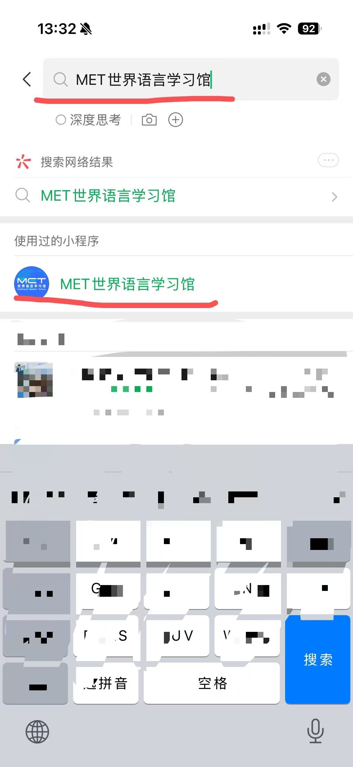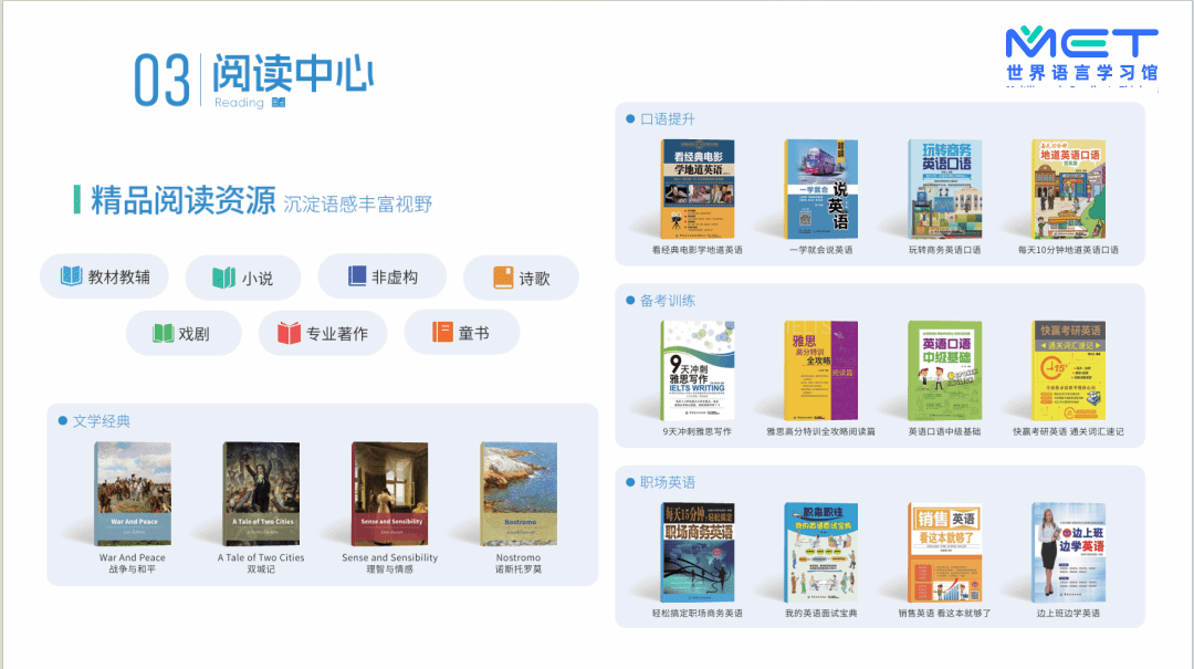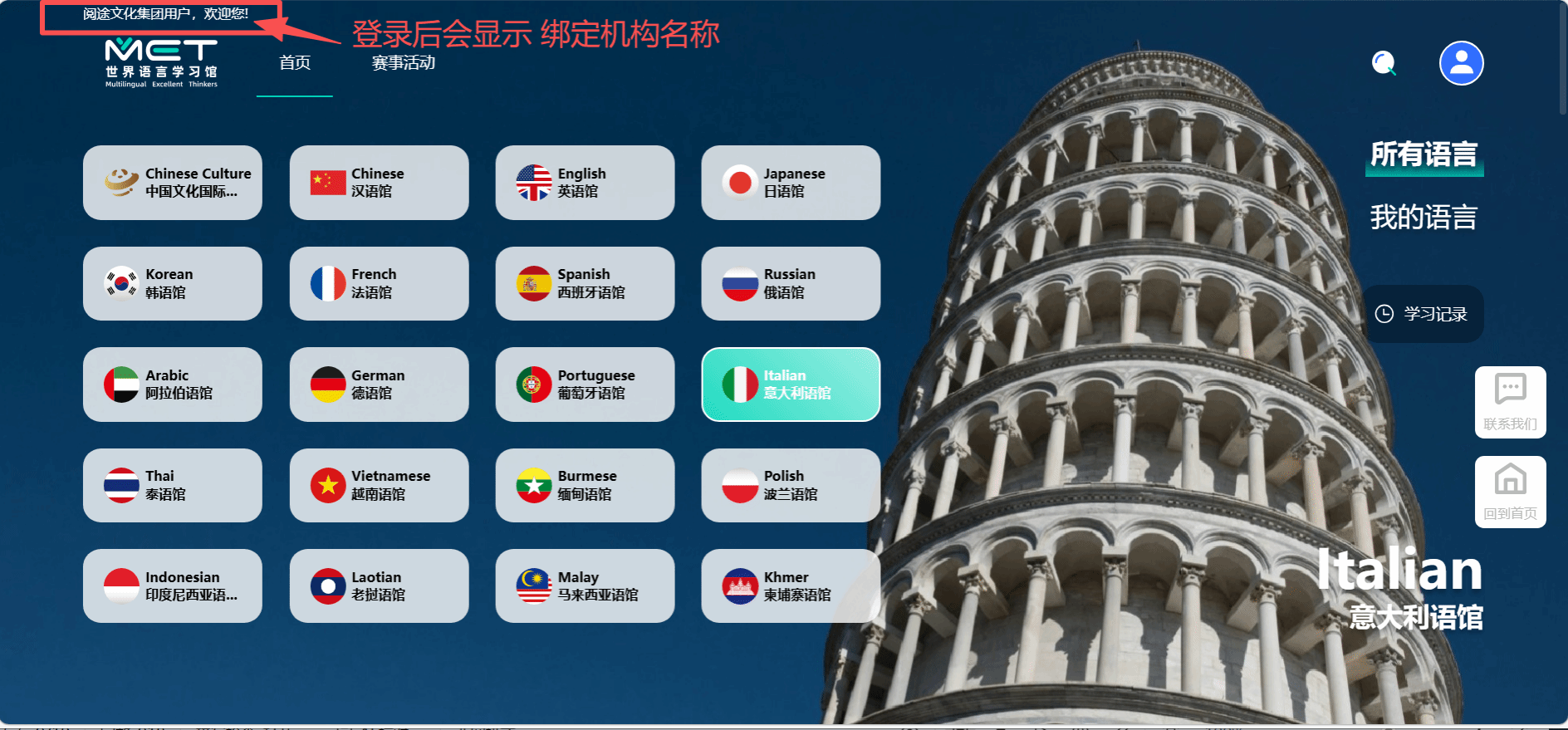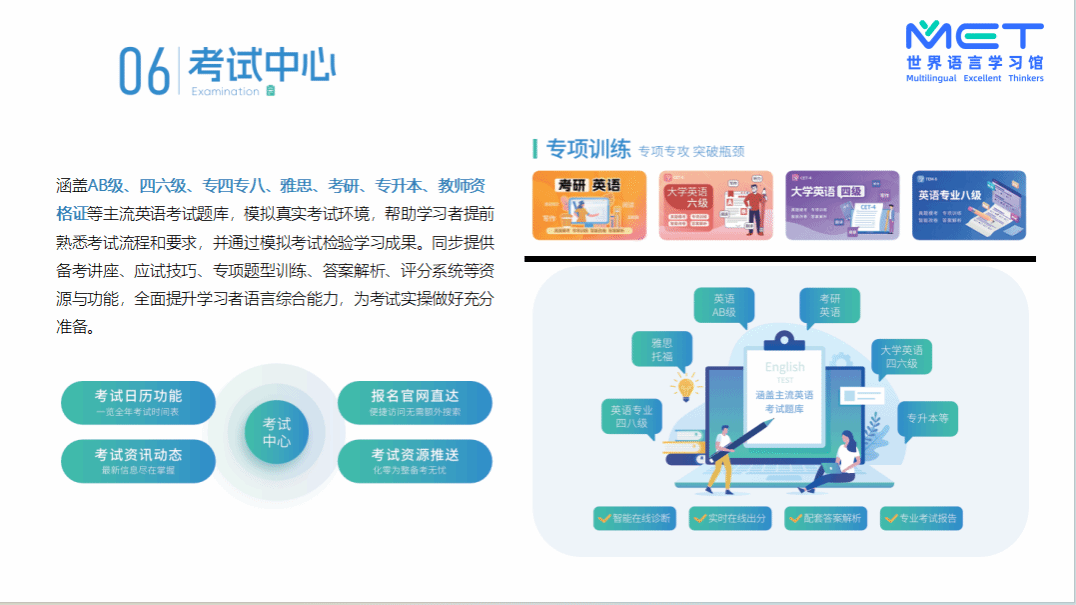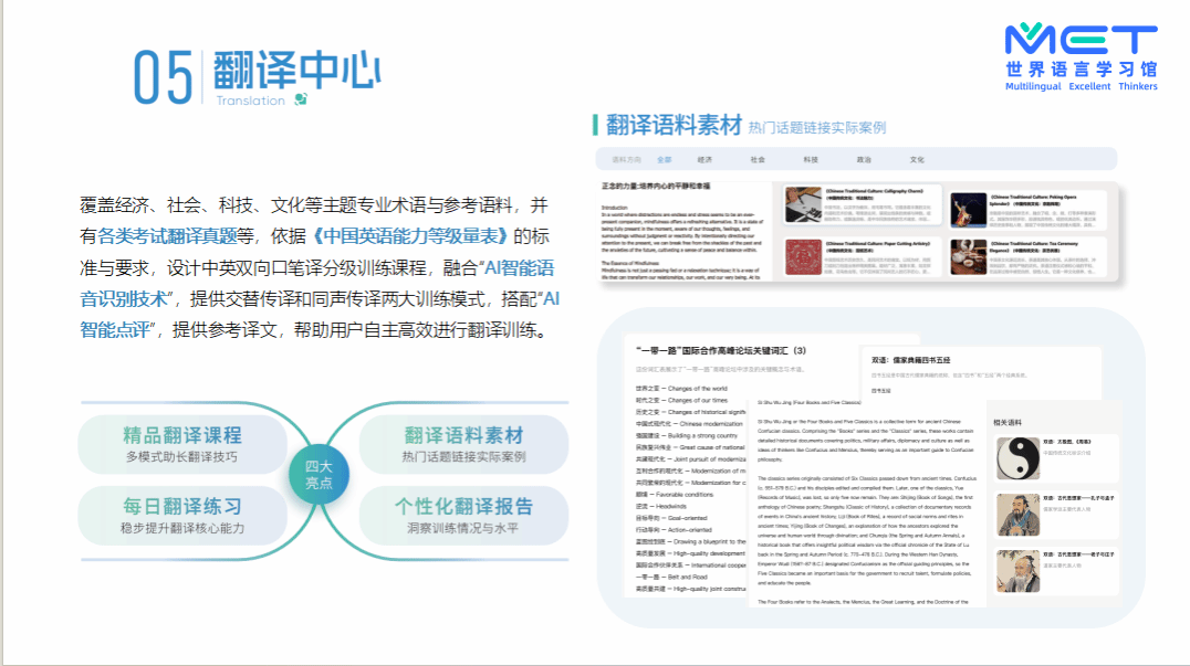 移动端访问:微信小程序搜索「MET世界语言学习馆」,使用个人账号登录访问