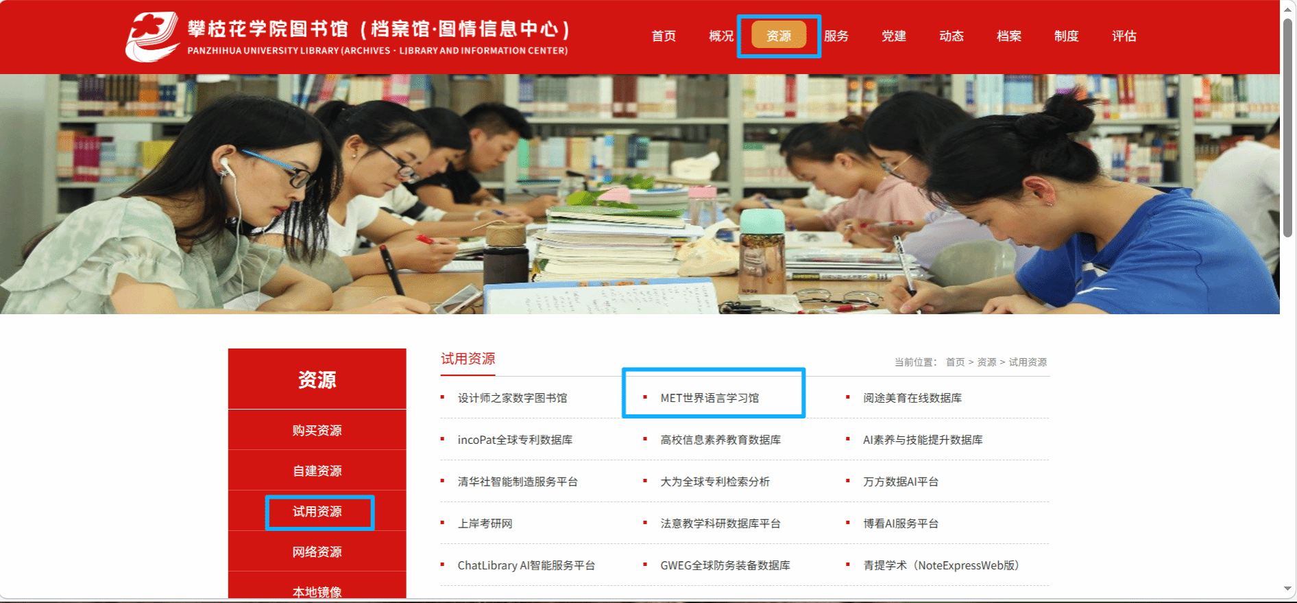 1.登录“攀枝花学院图书馆官网”→“资源”→“试用资源”→“MET世界语言学习馆”