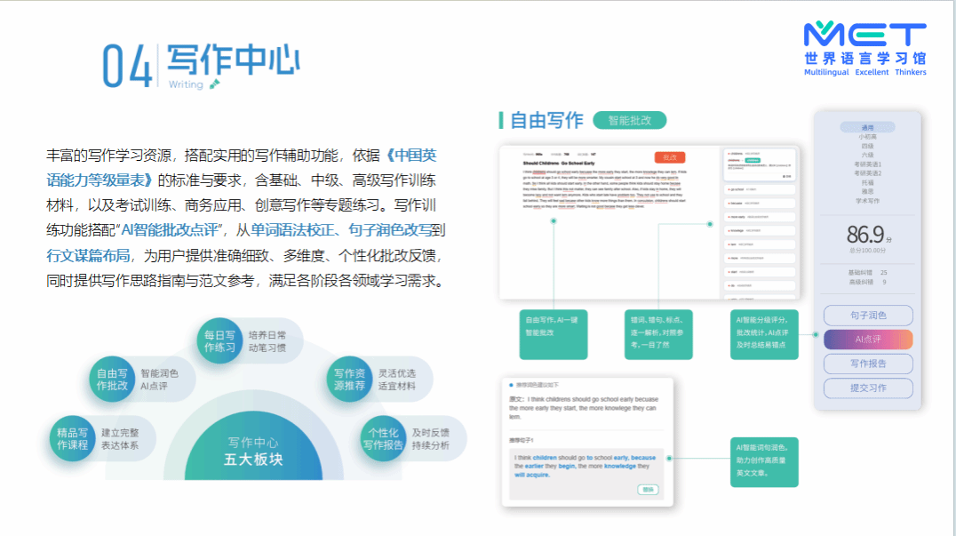 含基础、中级、高级写作训练材料,以及考试训练、商务应用、创意写作等专题练习,写作训练功能搭配“AI智能批改点评”,包含单词语法校正和句子润色改写,并同时提供写作思路指南与范文参考。