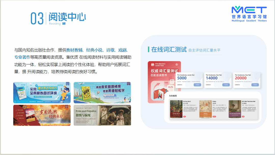 提供教材教辅、小说、诗歌、戏剧、专业著作、非虚构等高质量英文阅读资源。