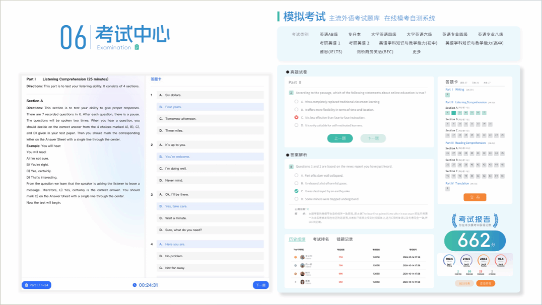 涵盖AB级、四六级、专四专八、雅思、考研、专升本、教师资格证等主流英语考试题库。考试系统配套“智能改卷功能”与“AI评分技术”,实时在线改卷出分,同步提供备考讲座、应试技巧、专项题型训练、答案解析等资源与功能。