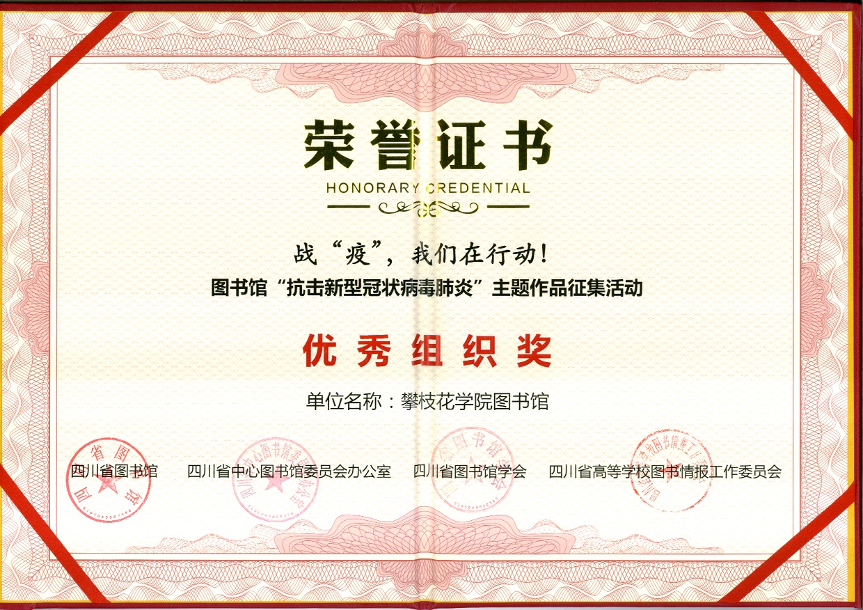 近日,我校图书馆荣获四川省图书馆、四川省图书馆学会、四川省高校图工委联合颁发的“‘抗击新型冠状病毒肺炎’主题作品征集活动优秀组织奖”。今年2月至4月,为贯彻落实党中央、国务院关于新冠肺炎疫情防控工作决策部署,做好疫情防控工作以及加强疫情防控宣传,积极开展疫情防控专题创作,鼓舞民心、激励斗志,用文化的力量为全省乃至全国疫情防控工作作出贡献。四川省图书馆、四川省图书馆学会、四川省高校图工委联合面向四川省各公共图书馆和高校图书馆馆员、读者开展“战‘疫’,我们在行动!――图书馆‘抗击新型冠状病毒肺炎’主题作品征集活动”。