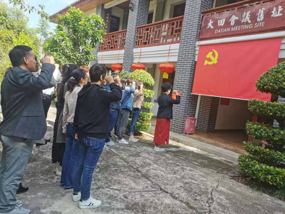 在“大田会议”遗址楼前、在“大田会议”简介版前、在一副副珍贵的历史照片前……,大家驻足参观,沉思感慨,热血沸腾。参观活动中,全馆党员和入党积极分子集体高唱“没有共产党就没有新中国”,全馆党员面对党旗庄严地重温入党誓词。雄壮的歌声和高亢的誓言响彻云霄。