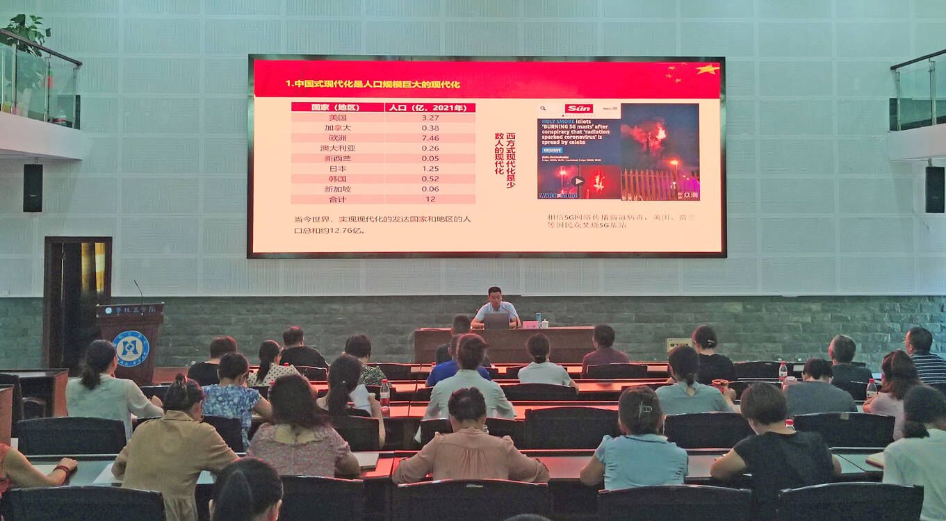 为深入学习贯彻习近平新时代中国特色社会主义思想,5月31日下午,后勤党总支和图书馆党支部在学术报告厅联合举办了主题教育集中辅导报告会,党员干部和职工参加了学习。马克思主义学院王一涵副教授以《把握中国式现代化内涵 领悟中国共产党初心使命》为题作辅导报告。